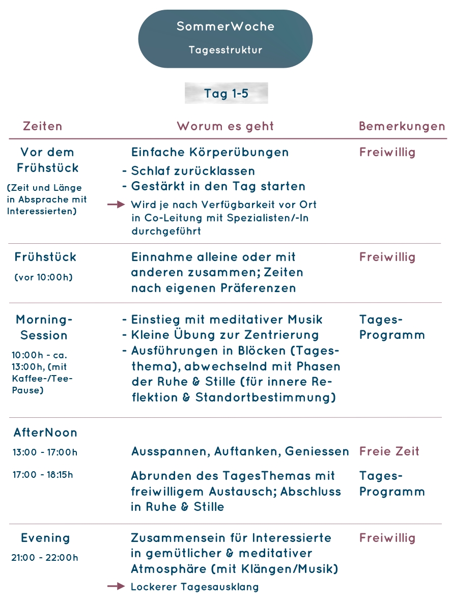 • Das Ziel der SommerWoche ist aber nicht ein kursähnlicher Ablauf, mit einem vollgepackten Programm. Es gibt nichts zu erreichen und die Wissensvermittlung steht nicht im Vordergrund. Im Gegenteil - Sie sollen sich v.a. wirklich erholen, d.h. sich wirklich entspannen und Ihren Körper & Geist wirklich regenerieren.
