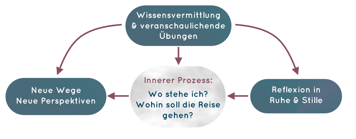 • Phasen der Ruhe und Stille zur Reflexion & Wahrnehmung der inneren Prozesse und zum Andocken an innere Quellen in Zuständen tiefer Versenkung.